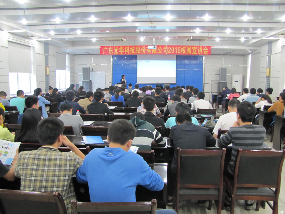光華科技2015校園招聘會通過校園宣講會、現(xiàn)場招聘會、網(wǎng)絡(luò)招聘三種方式予以實施,截止到11月14日,校園宣講會已在中山大學(xué)、華南理工大學(xué)、暨南大學(xué)、湖南大學(xué)、中南大學(xué)、武漢大學(xué)、華中科技大學(xué)、四川大學(xué)、電子科技大學(xué)、上海交通大學(xué)、華東理工大學(xué)、北京理工大學(xué)、北京化工大學(xué)及南昌大學(xué)等14所國內(nèi)重點知名高校順利召開。