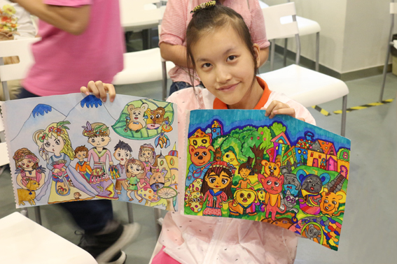 現(xiàn)場的活動里,先是開展了有趣的按指令畫畫小熱身環(huán)節(jié)。隨后,主持人向大家展現(xiàn)了孩子們一幅幅美妙的繪畫作品,有的構(gòu)圖新穎,有的色調(diào)優(yōu)美,有的畫風(fēng)細致……每一幅畫,都蘊藏著孩子們對社會的感受,以及對美好生活的向往和祝福。精彩的畫作,加上主持人妙語連珠的講解,使得現(xiàn)場變成一片歡樂的海洋。