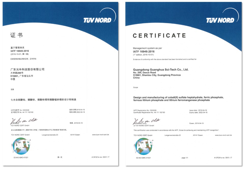 目前,經(jīng)過(guò)不懈努力,公司的七水合硫酸鈷、磷酸鐵、磷酸鐵鋰和磷酸錳鐵鋰近日順利通過(guò)了IATF16949:2016認(rèn)證,這意味著上述產(chǎn)品的設(shè)計(jì)及制造達(dá)到汽車行業(yè)質(zhì)量管理的先進(jìn)水平,產(chǎn)品品質(zhì)更加穩(wěn)定可靠。