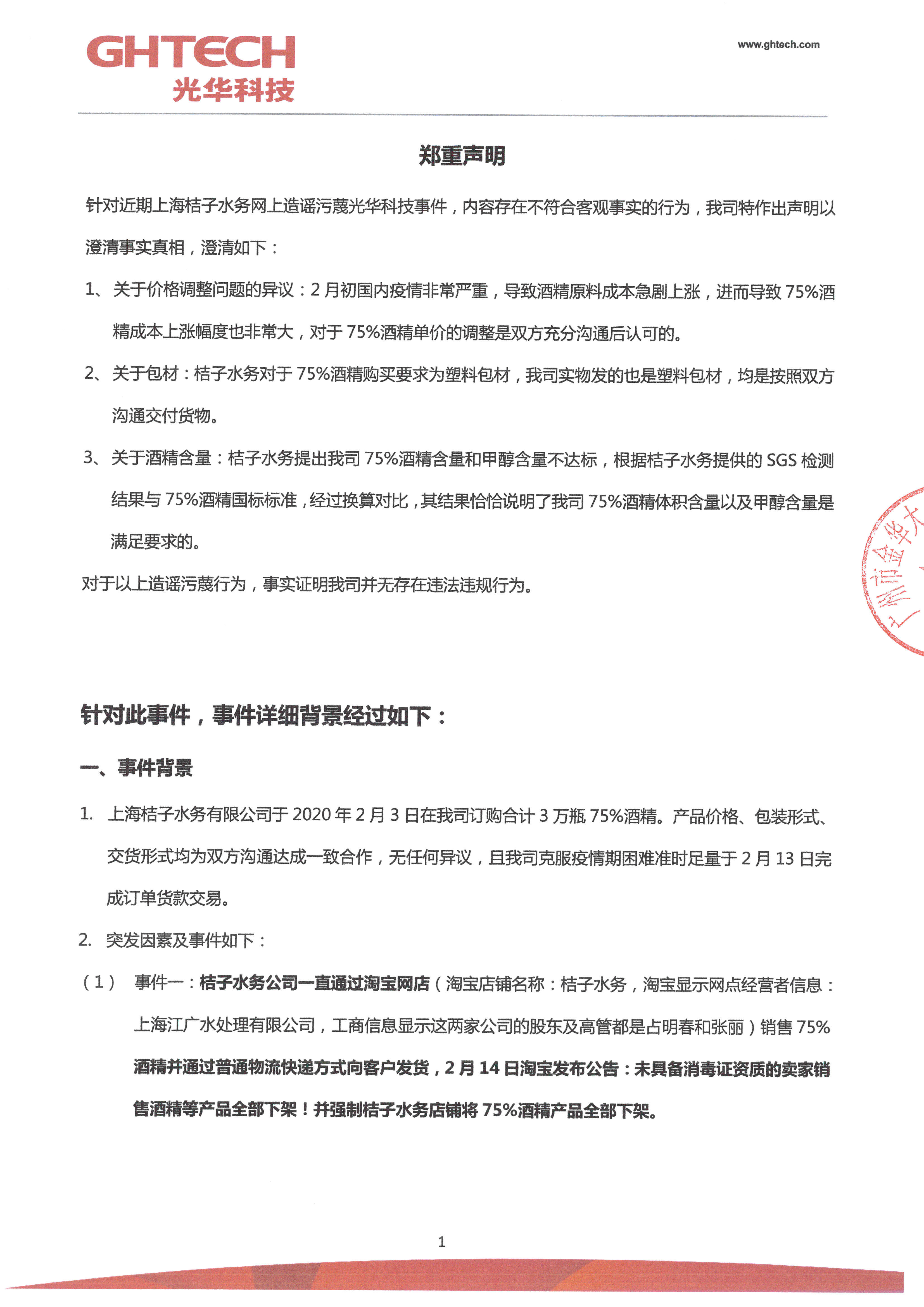 針對近期上海桔子水務(wù)網(wǎng)上造謠污蔑光華科技事件的聲明